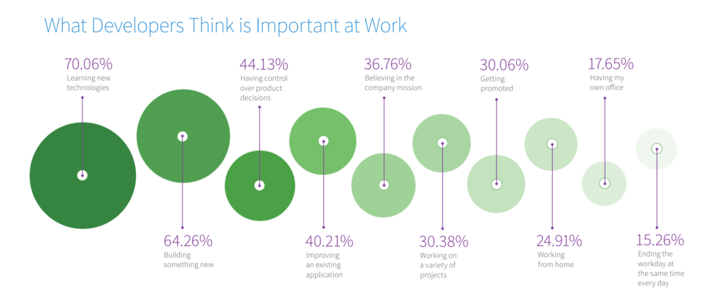 According to Deloitte, “Organizations with a strong learning culture are 92% more likely to develop novel products and processes, 52% more productive, 56% more likely to be the first to market with their products and services, and 17% more profitable than their peers.” This corresponds with the mindset of the people you’re trying to hire as a tech recruiter. The opportunity to grow professionally is appealing to developers as 70% of them believe learning new technologies is important at work (Stack Overflow). Let your programmers learn, sponsor courses and encourage self-learning.