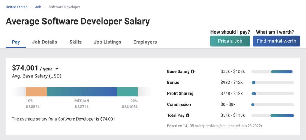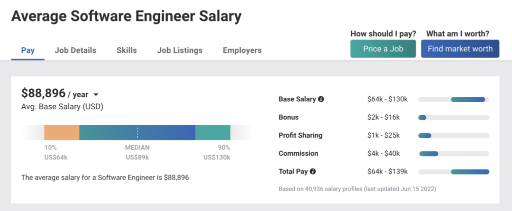 A quick glance at PayScale research suggests that at the time of writing, the average salary of a software engineer in the United States is $ 88,896 while the average for a software developer job is $74,001. Although, these salaries would likely fluctuate depending on whether the role was for junior developers or senior developers and also between each programming language.